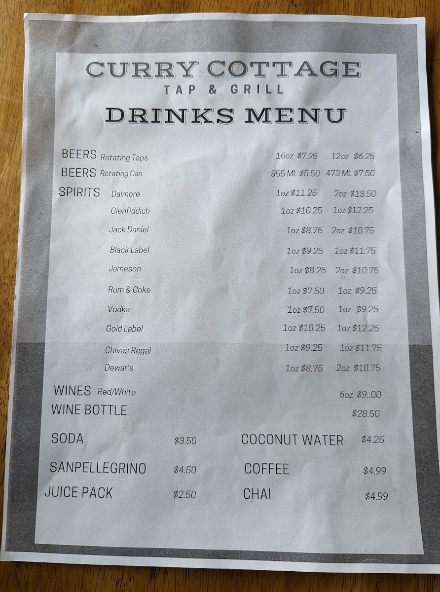 To pair with your meal, The Curry Cottage offers a selection of drinks including Rum & Coke, Gold Label, and Dewar’s, along with refreshing non-alcoholic options like Soda and Sanpellegrino.